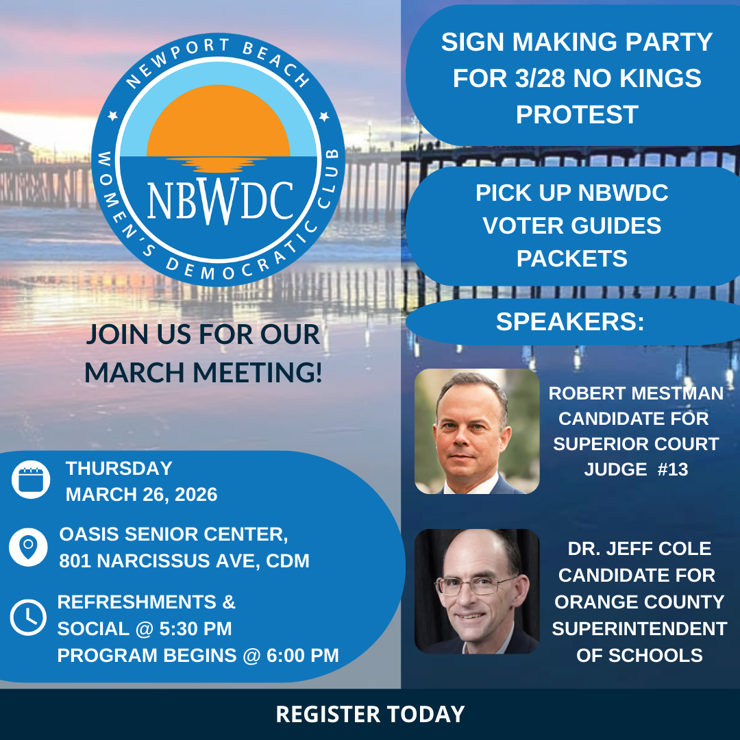 In addition to our Speakers Program, we will discuss candidates for the upcoming California Primary and the March 28 No Kings OC events with various meet-up options for everyone.